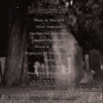 RAW DEATH INSPIRED DOOM, RIGOR SARDONICOUS DRAWS FROM TRULY APOCALYPTIC SOURCES FOR THEIR INSPIRATION AND FORWARD INTO THIS VOID A SONIC ATMOSPHERE NOT OF FRIGHTENED AND DEPRESSIVE APPREHENSION, BUT RATHER OF FRIGHTENING, HORRIFIC BLEAKNESS DRAWN FROM THE PERSPECTIVE OF THE ABSENCE OF HOPE FOR ALL LIFE! ... more